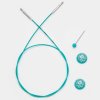 Pružné zelenomodré lanko s otáčecím mechanismem, nebo pevně vsazené, k výměnným kruhovým jehlicím a háčkům Knit Pro - The Mindful Collection.